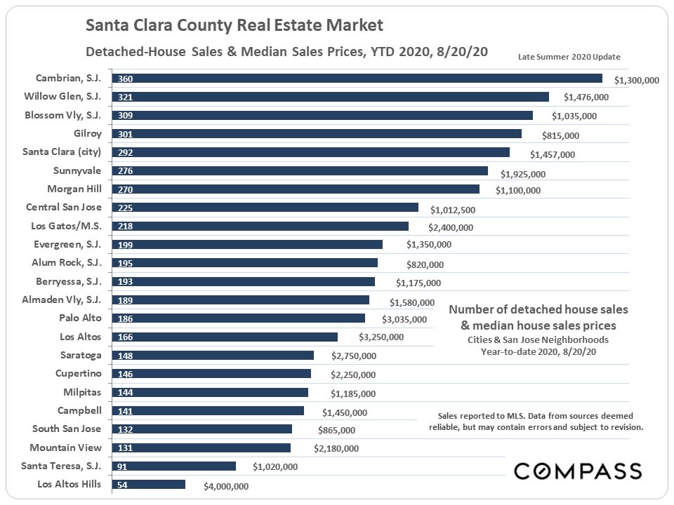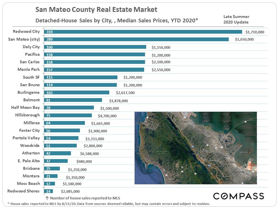 Pandemic, shelter in place, mass unemployment, terrible financial hardships for many households and small businesses, new ways of working, office buildings empty, people move, dreadful fires, an anxious presidential election, interest rates to historic lows, stock markets to new highs, IPO mania breaks out again, vaccines begin to arrive – and, after an initial crash in activity, the real estate market went into hyper-drive, with median home sales prices hitting new peaks. The luxury home market in particular was extremely strong. 2020: a year of extremes. There is a vast variety of homes within the region and within cities and how median sales prices apply to any particular property is unknown without a specific comparative market analysis. Median sales price is that price at which half the sales occurred for more and half for less. It is a very general statistic that often disguises a wide range of prices in the underlying individual sales. Median sales prices are often affected by factors besides changes in fair market value. Based upon sales reported to MLS – not all sales are reported. Data from sources deemed reliable, but may contain errors and subject to revision. All numbers are approximate. Late reported sales may alter numbers, though typically only to a slight degree.