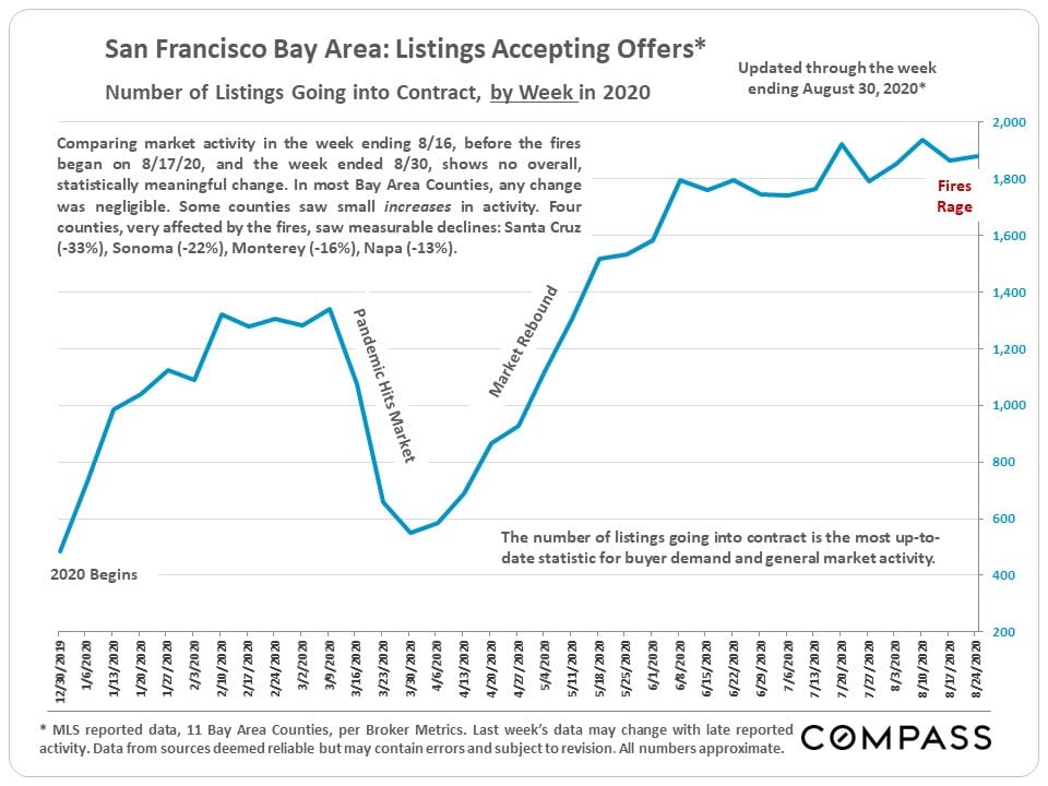 Surprisingly, the terrible fires did not significantly impact the number of deals being made in most Bay Area counties during the last 2 weeks of August - the exceptions being Santa Cruz, Sonoma, Monterey and Napa Counties, which saw declines of 13% to 33%. In the Stanford Circle, the numbers of listings going into contract in the second week of August (before the fire) and in the fourth week (deep in crisis) were virtually the same. And activity has actually jumped up in the first week of September. (This chart looks at week by week activity in the Bay Area.)
